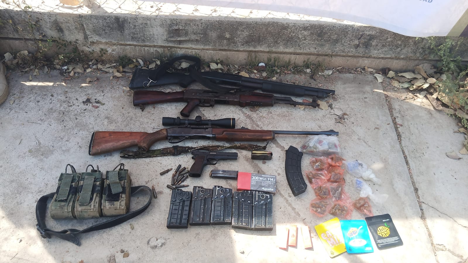 En una primera acción, durante recorridos aéreos y terrestres en el poblado de Cosalá, elementos navales desactivaron dos antenas de interferencia y aseguraron cuatro vehículos, tres armas largas, un arma corta, siete cargadores, 293 cartuchos de diferentes calibres y 22 dosis de presunta droga.